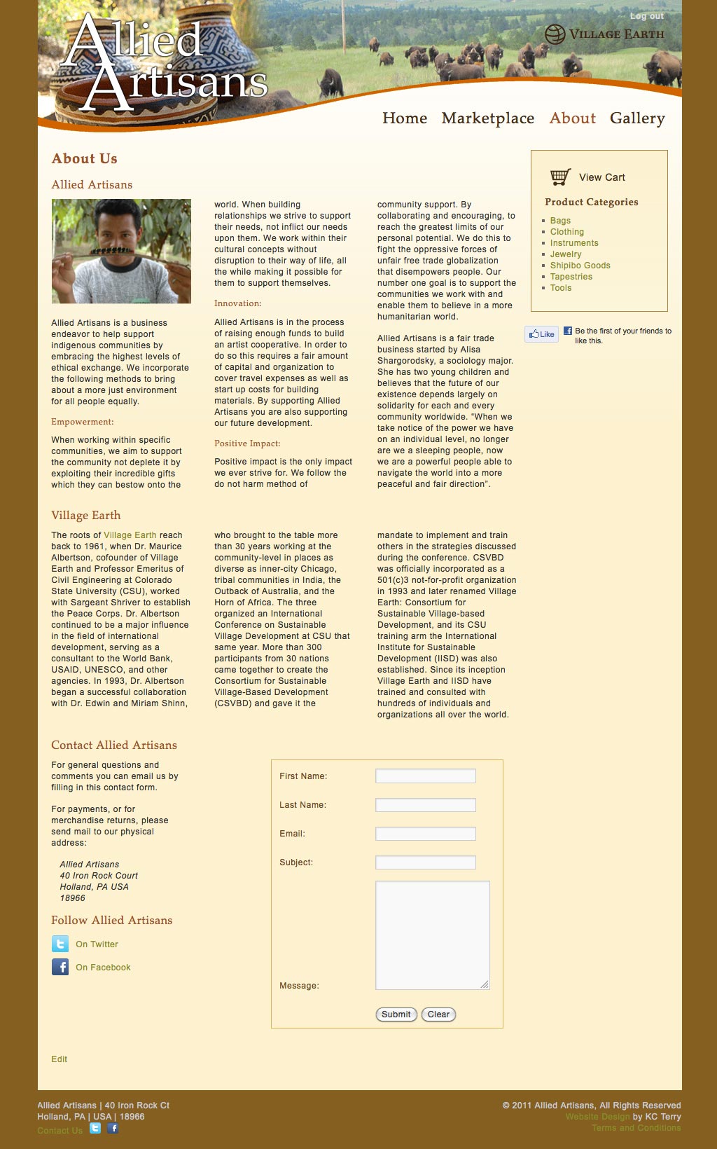 A website designed for Allied Artisans, a company that sells fairly-traded clothing, jewelry, and other goods