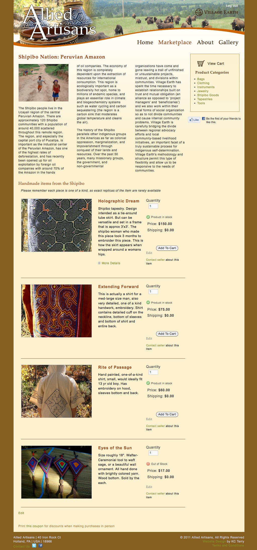 A website designed for Allied Artisans, a company that sells fairly-traded clothing, jewelry, and other goods