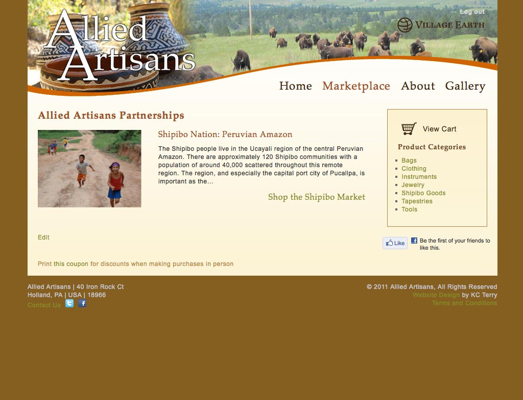 A website designed for Allied Artisans, a company that sells fairly-traded clothing, jewelry, and other goods